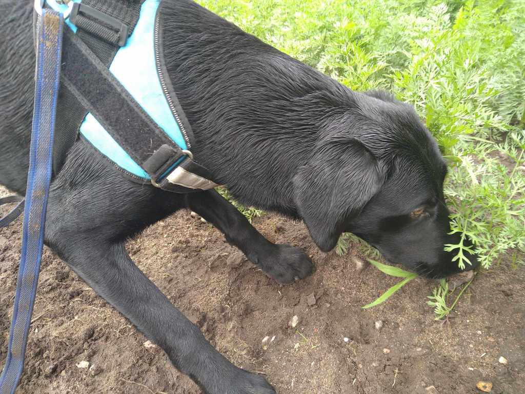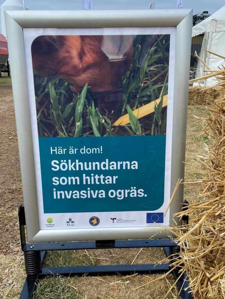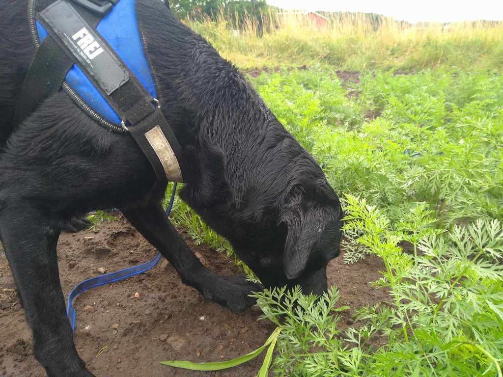 ). I dag har han visat att det går att hitta ogräset Hönshirs på fält med korn. Ett trettiotal intresserade lantbrukare tittade på när han sökte. Frej bryr sig inte det minsta om folksamlingen utan söker, hittar och markerar runt deras fötter! ”![]()