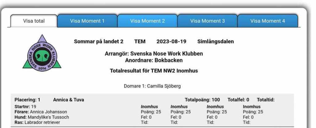 ”Idag har vi varit på utflykt till Simlångsdalen och tävlat NW2 TEM inomhus. Mandylike’s Tussoch ”Tuva” jobbade jättefint i värmen och hamnade överst på pallen med diplom. Nu har hon 3 diplom i TEM2 inomhus. Kul!