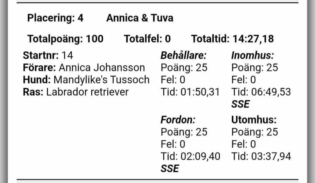 Riktigt bra känsla i söken (förutom behållare kanske, Tuva var totalt ointresserad av behållarna från start… vilket skapar lite stresspåslag på mig men visade sig att det inte fanns någon doft). Idag var hon sådär härligt girig, kortaste vägen fram till gömmorna.