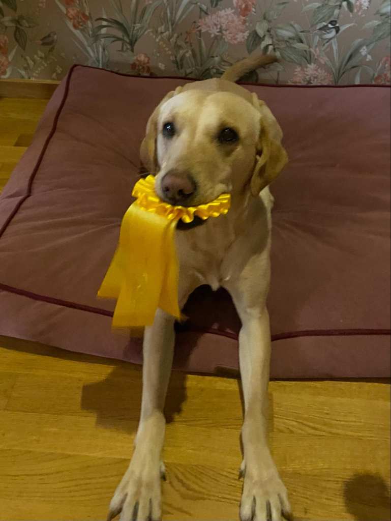 ”Igår tog denna fina tjejen, Mandylike’s Yoda, sitt sista kvalificerad resultat i rallylydnad fortsättning så nu är vi uppe i avancerad klass. Hennes titel är RLDNF ” 😀